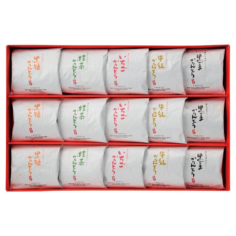 黒糖かりん糖(約10g)・黒胡麻かりん糖(約10g)・牛乳かりん糖(約10g)・抹茶かりん糖(約10g)・いちごかりん糖(約10g)×各3 ■アレルギー:乳・小麦
