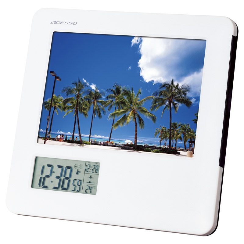 お気に入りの写真を飾れるフォトフレーム付き電波時計。○電波時計40/60kHz自動受信○時間・月日・曜日表示○温度表示○アラーム・スヌーズ機能