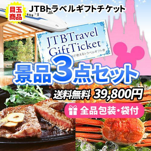 JTB旅行券をメインに人気のステーキと海鮮を加えた景品3点セット