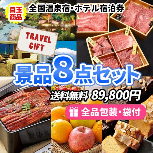 全国温泉宿・ホテル宿泊券を目玉に大人気のグルメを含めた盛り上がり景品8点セット