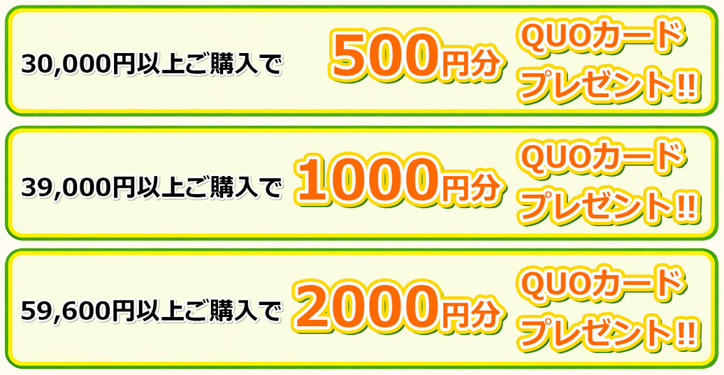 詳しくはこちら商品代金合計30,000円以上のお買い上げで500円。最大で2,000円分のQUOカードをプレゼント!