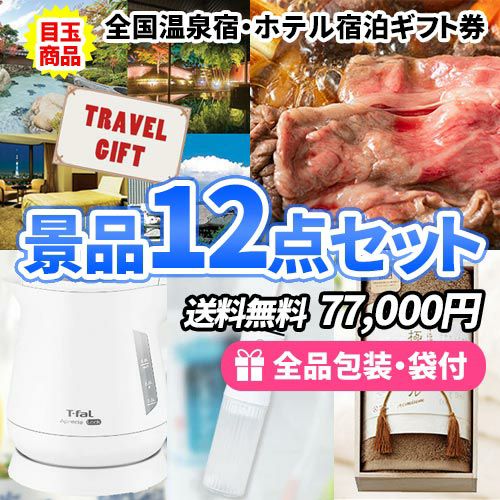 全国温泉宿・ホテル宿泊券をメインにキッチン家電・生活雑貨の詰まった景品12点セット