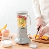 キズや汚れがつきにくいガラスボトルを採用。最大容量750mlのボトルで3~4人分のジュースが作れます。4枚刃のステンレスカッターで、家庭用の氷もらくらく攪拌。回しすぎなどによるモーター加熱防止のサーキットプロテクターを搭載。