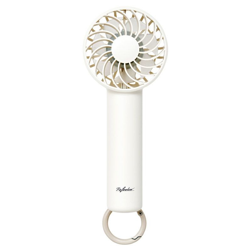 弱・中・強+リズムモードの4段階風量調節が可能。持ち運びに便利なカラビナ付。カラビナは折りたたむことでスタンドにもなるため、デスクファンとしてもご使用いただけます。USBコード付。