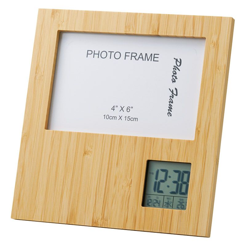 竹の風格漂うフォトフレームクロック。○クォーツ○日付表示○温度○縦置き・横置き対応○アラーム