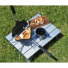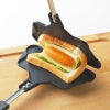 食パン1枚で焼ける。お手軽ホットサンドメーカー。アルミニウム合金で軽量タイプ。フッ素樹脂加工でお手入れ簡単。横向きに挟んで焼けば、具がたっぷり入る長方形型に。ナナメに挟んで焼くと、耳がサックリ。三角形のホットサンドに。ガス火専用。