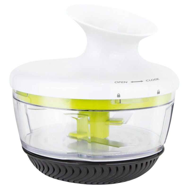 くるくるひねってころころ転がすだけ。片手で簡単にみじん切り。じょうご付きでフタをしたまま調味料の追加ができます。電源不要で自分で刃を回転させるので、みじん切りを好みのサイズに調整しやすい。安全に保管できる刃カバー付き。