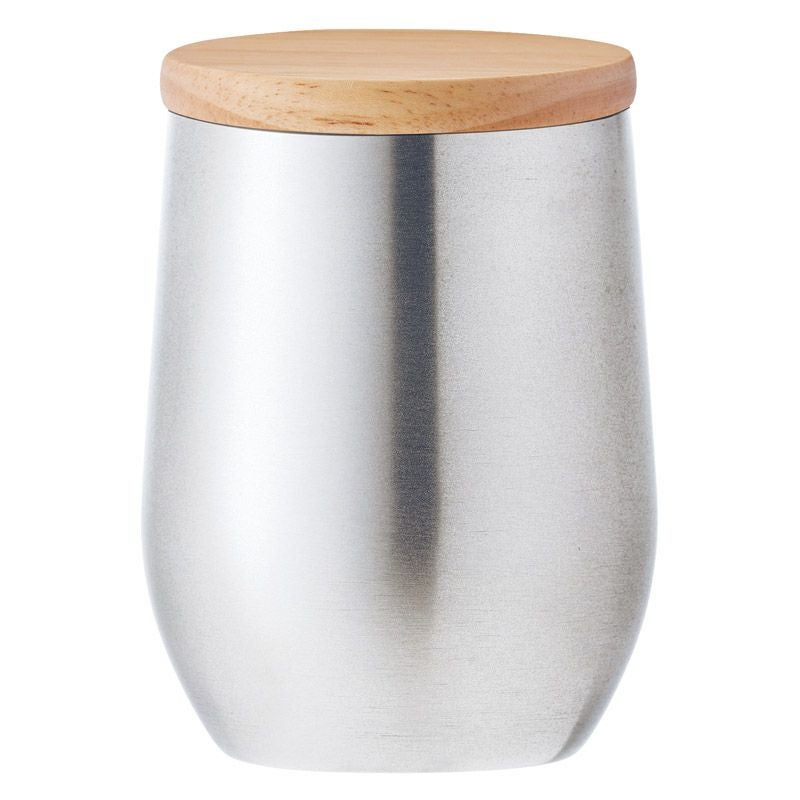 天然木の蓋がついた真空2重構造のステンレスタンブラー。パッキン付きの木蓋で保冷温の効果がさらにアップし、真空2重構造なので飲み物の温度をしっかりとキープ。
