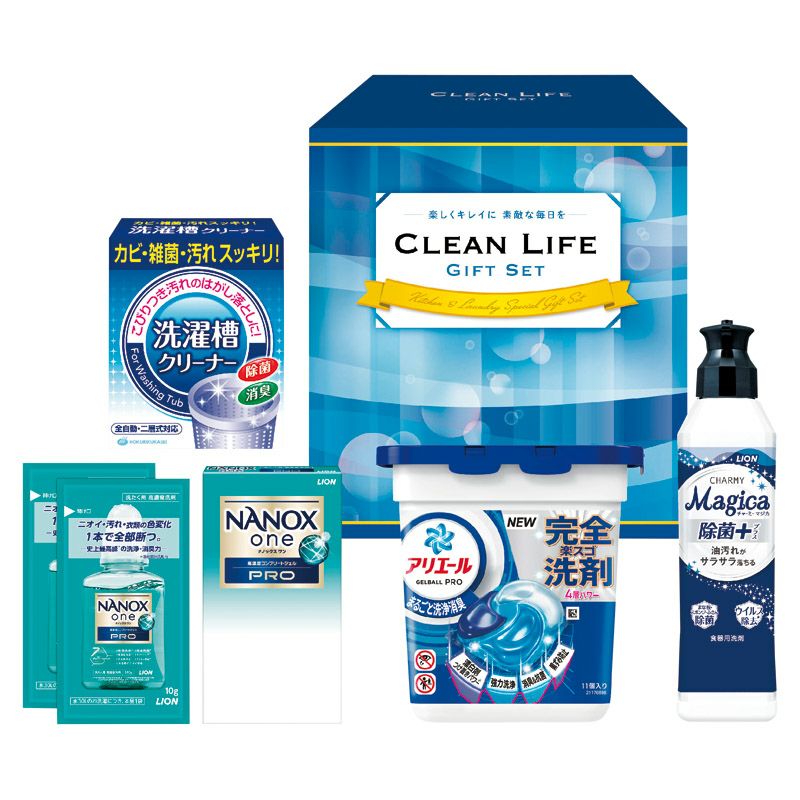 P&Gアリエールジェルボール(11個)・ライオンナノックスワンプロ(10g×2袋)・ライオンチャーミーマジカ除菌+(220ml)・洗濯槽クリーナー(50g×2包)×各1