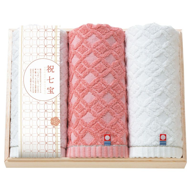 吉祥柄の紅白のタオルを木箱に入れてお届けします。輪が四方八方に広がっていくことから「しっぽう」となり、人と人のご縁(輪)は、七つの宝と同等の価値があるとされました。そこから七宝の名がつき、吉祥柄となりました。
