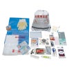 非常袋(反射テープ付)(約440×380mm)×1、非常用給水バック(5L)・ハンディライト・防災用ウエットティッシュ(20枚)・コンパクトFMラジオ・すべり止め手袋・防寒シート・救急絆創膏(2サイズ40枚入)・カイロ・マスク・非常用トイレ・緊急用ホイッスル・ゴミ袋(45L10枚入)・タオル・ブルーシート(2畳用)・布テープ・ガーゼ・包帯・ハサミ・ピンセット・毛抜き・耳かき・圧縮袋・ボールペン・ふせんメモセット・防災ガイド×各1