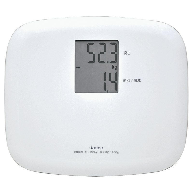 前回の体重を表示!体重の増減を自動で表示する体重計。前回の体重を自動で記憶表示。今回の体重との差を表示します。前回の体重と比較できるので、毎日の体調管理に最適。のると自動で測定を開始します。持ち運びに便利な軽量ボディ。ホールド機能。オートパワーオフ機能。ローバッテリー表示。