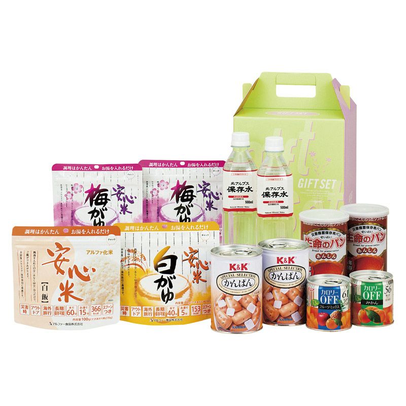 大観峯北アルプス5年保存水(約500ml)・K&Kかんぱん(氷砂糖入り)(約110g)・5年保存「生命のパンあんしん」(ココア2個入)(約100g)・アルファー安心米(梅がゆ)(約42g)×各2、アルファー安心米(白がゆ)(約41g)・アルファー安心米(白飯)(約100g)・SSKカロリーOFFフルーツミックス(約185g)・SSKカロリーOFFみかん(約185g)×各1