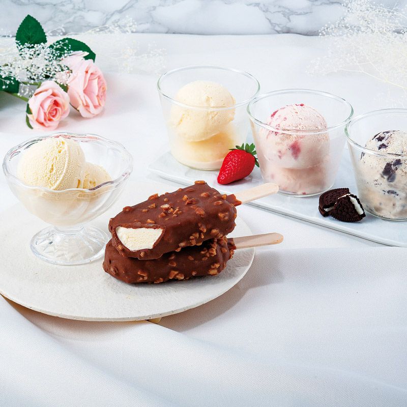 ミニカップ(バニラ)110ml・バー(バニラチョコレートマカデミア)80ml×各2、ラバーズアソート(バニラ・ストロベリー・クッキー&クリーム各70ml×2)×1 ■アレルギー:卵・乳・小麦