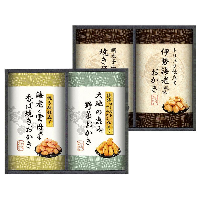 トリュフ仕立て伊勢海老風味おかき(40g)・焼き塩仕立て海老と雲丹風味の香ば焼きおかき(40g)・淡路ローストオニオン仕立て大地の恵み野菜おかき(40g)・明太子仕立て焼き蟹おかき(40g)×各1
