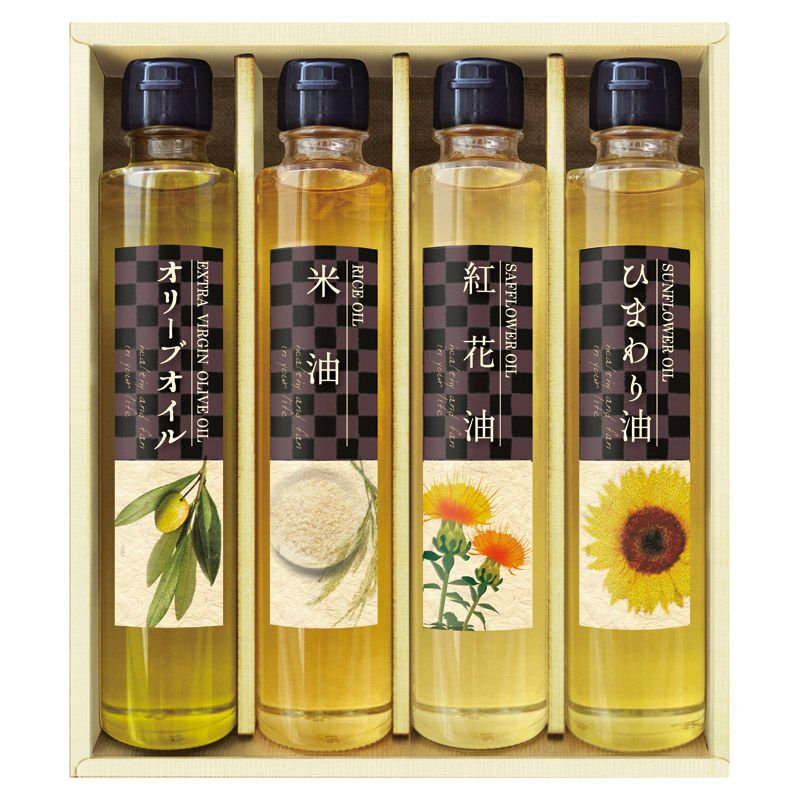 エクストラバージンオリーブオイル(約165g)・紅花油(約165g)・米油(約165g)・ひまわり油(約165g)×各1