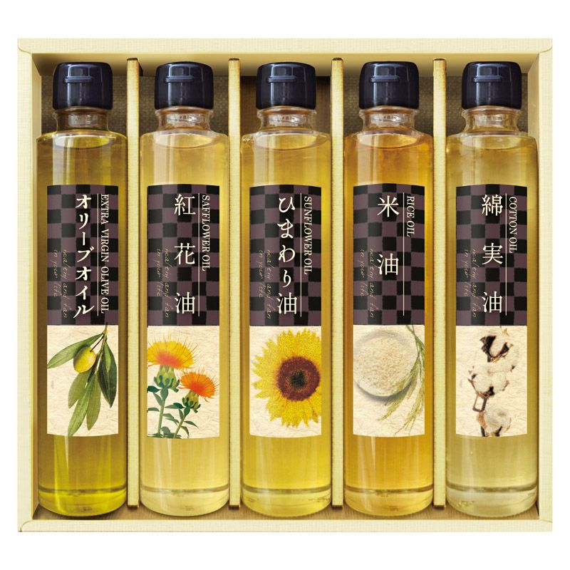エクストラバージンオリーブオイル(約165g)・ひまわり油(約165g)・紅花油(約165g)・綿実油(約165g)・米油(約165g)×各1