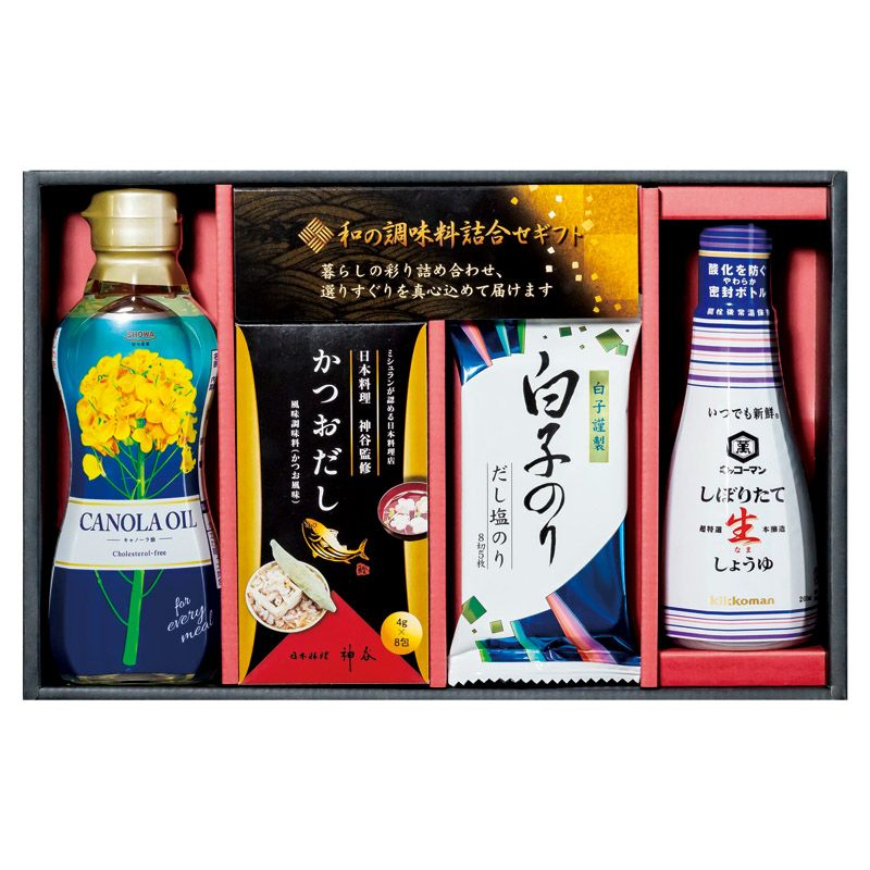 キッコーマンしぼりたて生醤油(200ml)・かつおだし(4g×8袋)・白子だし塩のり(8切5枚)・昭和キャノーラ油(300g)×各1