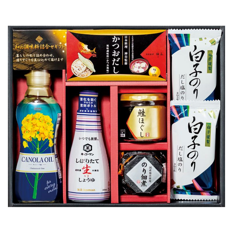 鮭ほぐし(50g)・のり佃煮(80g)・かつおだし(4g×8袋)・キッコーマンしぼりたて生醤油(200ml)・昭和キャノーラ油(300g)×各1、白子だし塩のり(8切5枚)×2