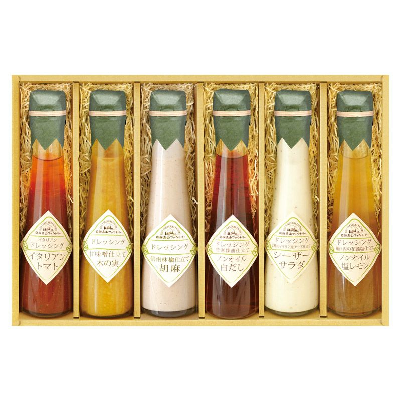 信州林檎仕立て胡麻ドレッシング(120ml)・2種のイタリア産チーズ仕立てシーザーサラダドレッシング(120ml)・瀬戸内の花藻塩仕立てノンオイル塩レモンドレッシング(120ml)・イタリアントマトのイタリアンドレッシング(120ml)・特選醤油仕立てノンオイル白だしドレッシング(120ml)・甘味噌仕立て木の実ドレッシング(120ml)×各1