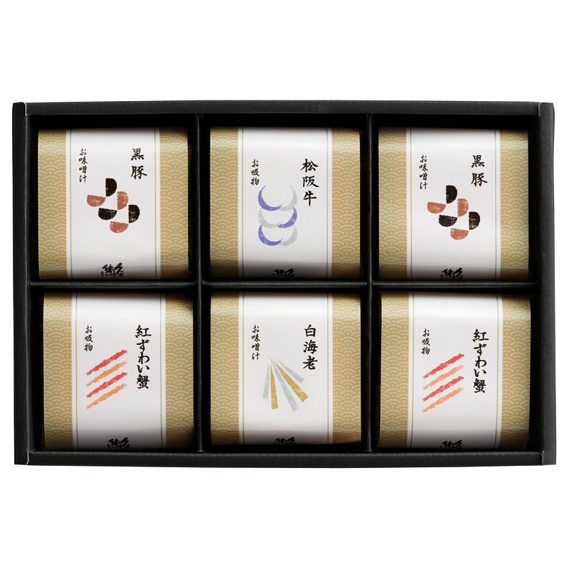 本格和風だしお吸物(紅ずわい蟹×2、松阪牛×1)、本格和風だしお味噌汁(黒豚×2、白海老×1) ■アレルゲン:小麦・えび・かに