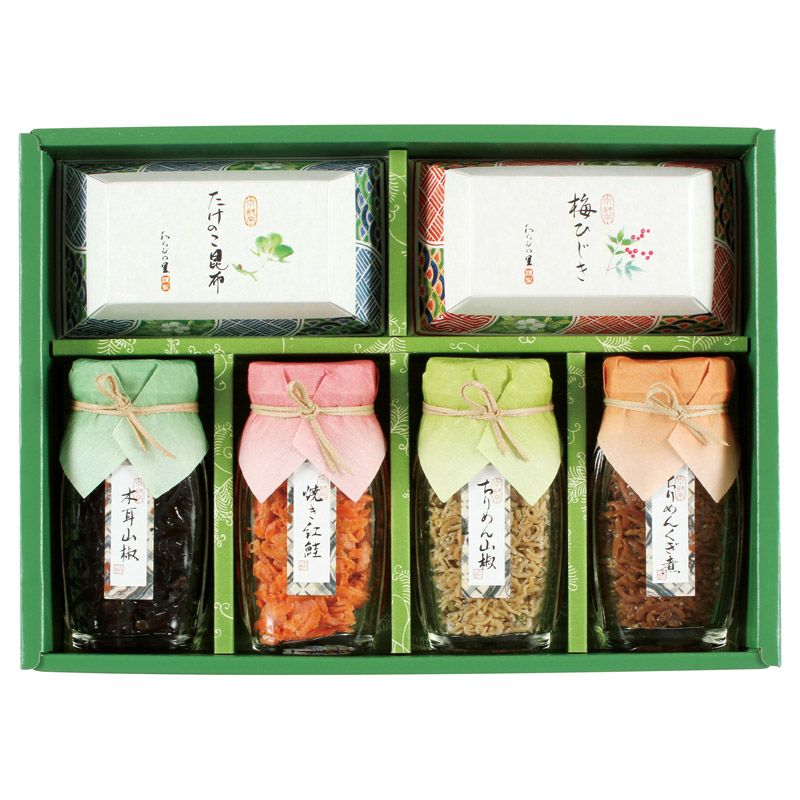 ちりめん山椒(約30g)・焼き紅鮭(約43g)・ちりめんくぎ煮(約45g)・木耳山椒(約55g)・たけのこ昆布(約50g)・梅ひじき(約50g)×各1 ■アレルギー:小麦