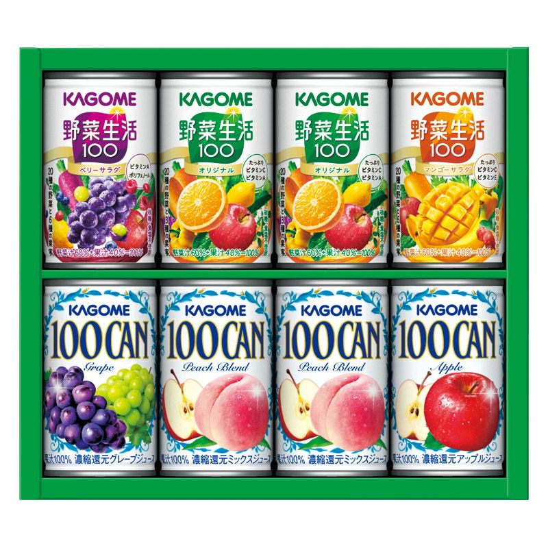 野菜生活100オリジナル(160g)×2、野菜生活100(ベリーサラダ・マンゴーサラダ)(160g)×各1、100CAN(アップル・グレープ)(160g)×各1、100CAN(ピーチブレンド)(160g)×2